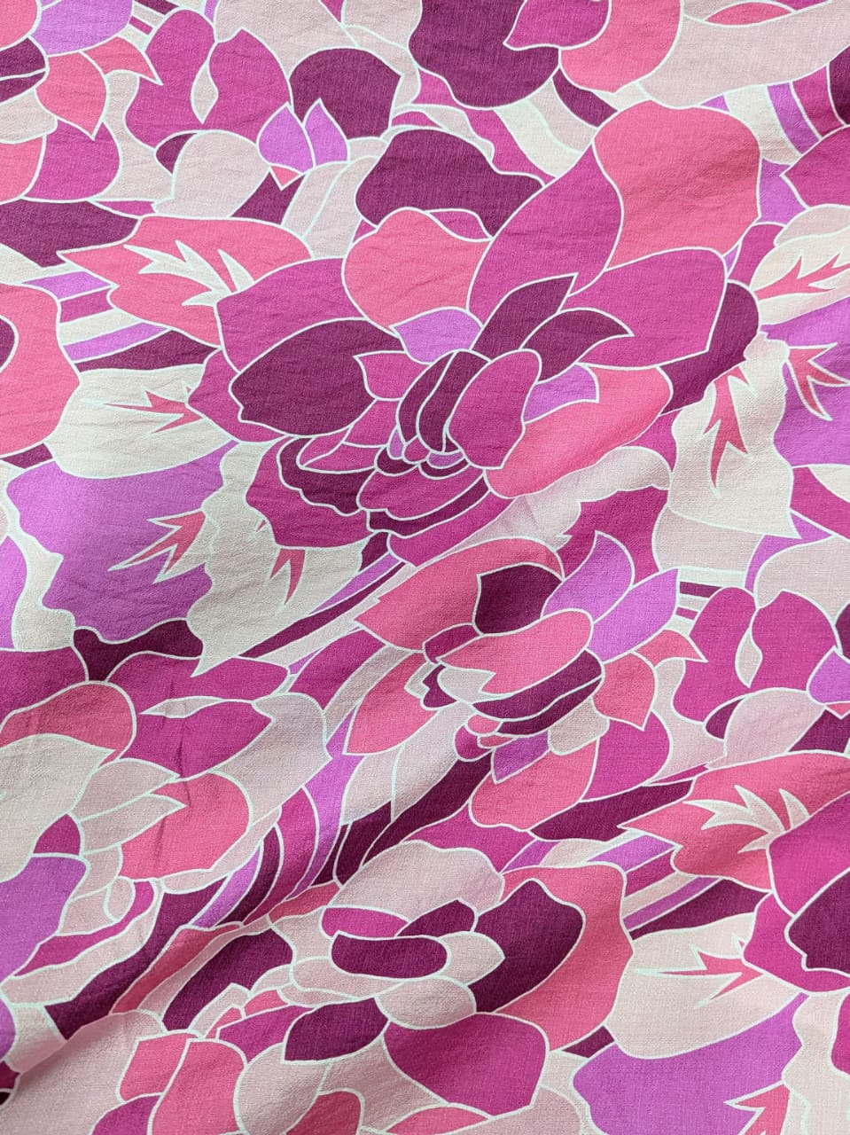 Esta tela destaca por su diseño moderno de hojas en tonos modernos sobre un fondo que combina, creando una apariencia fresca, elegante y muy versátil. Su estampado orgánico aporta movimiento y un estilo contemporáneo que se adapta tanto a prendas casuales como a piezas más sofisticadas.